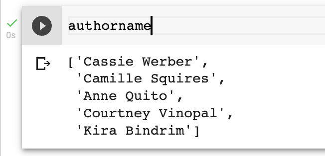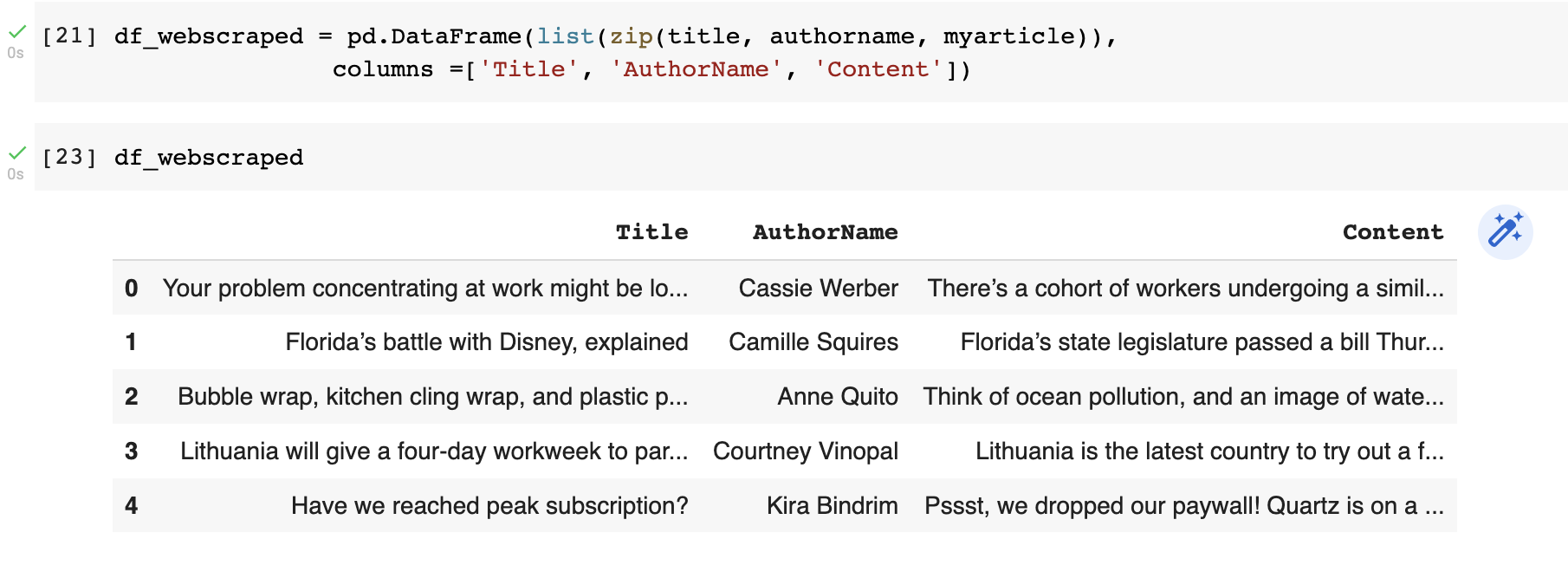 The hyperlinks for each article were passed into a BeautifulSoup object, it was parsed, to get the author name, article title, and article text using the “find” and “find_all” methods in the created “Soup” object.