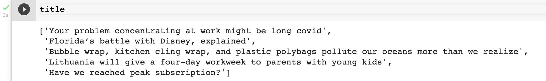 The find_all method of the soup object collates all the articles on the page into a list (“weblinks”). The URL corresponding to each article is stored in the “pagelinks” array.